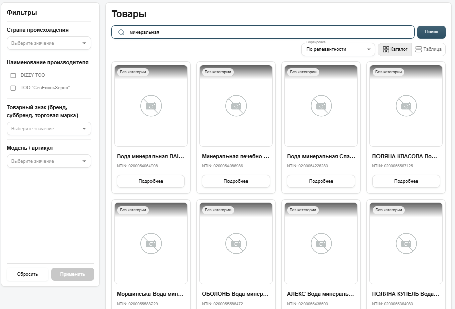- «Каталог» – раздел для просмотра зарегистрированных карточек товаров в Национальном каталоге сортированным по Общему классификатору товаров работ и услуг;