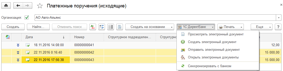Если настроен 1C:ДиректБанк, то отправить платежное поручение в банк можно несколькими способами: