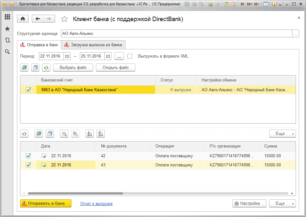 В рабочем месте выгрузки платежных документов необходимо указать банковские счета, для которых нужно произвести обмен и платежные документы, которые необходимо выгрузить.