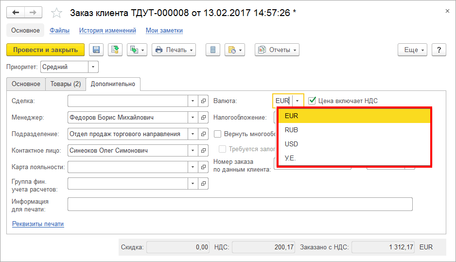 Валюта заказа связана с валютой соглашения, указанного в заказе. По умолчанию валюта заказа заполняется той валютой, которая указана в соглашении. Изменить валюту может только пользователь, для которого установлено право Отклонение от условий продаж. Все остальные пользователи должны согласовать изменение валюты в заказе по отношению к валюте, указанной в соглашении.