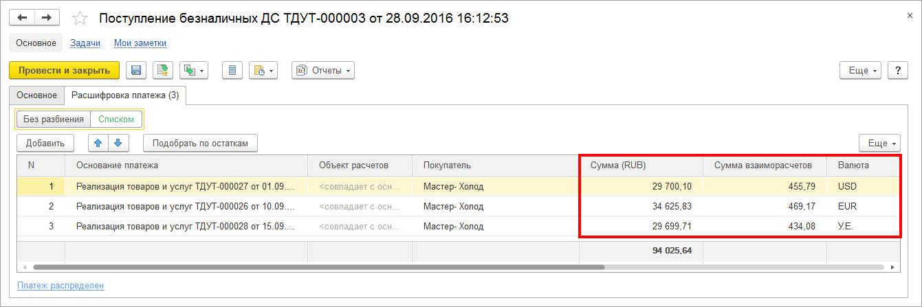 Валюта документов оплаты определяется валютой той кассы (или расчетного счета), по которой оформляются платежи. При подборе накладных в список оплачиваемых документов будет автоматически указываться валюта взаиморасчетов каждой накладной. При проведении документа оплаты будет автоматически рассчитана сумма взаиморасчетов в валюте, которая определена в качестве валюты взаиморасчетов в расчетном документе (накладной).