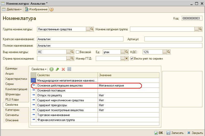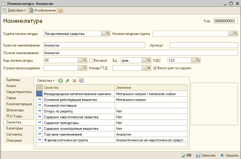 Каждый элемент справочника «Номенклатура» имеет список дополнительных реквизитов: торговое наименование, международное непатентованное наименование, фармакологическая группа, основное действующее вещество, содержит психотропные вещества, содержит прекурсоры, отпуск по рецепту, содержит наркотические вещества.