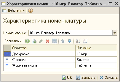 Конфигурация позволяет хранить информацию о фасовках, дозировках и формах выпуска лекарственных средств. Данная информация хранится в характеристике лекарственного средства. Для каждого лекарственного средства может быть создано любое количество характеристик. Использование характеристик позволяет анализировать остатки, а также определять себестоимость лекарственных средств в разрезе характеристик, т.е. фасовок, дозировок и форм выпуска.