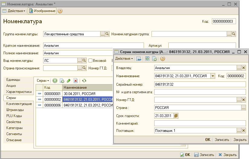 Есть возможность хранить информацию о серийном номере, номере и дате сертификата, дате выпуска, сроке годности, производителе и стране происхождения лекарственного средства. Вся эта информация хранится в сериях лекарственных средств. Использование серий позволяет вести учет лекарственных средств по срокам годности, анализировать остатки, а также определять себестоимость лекарственных средств, отдельно для каждой серии. Информация о сериях лекарственных средств хранится в справочнике «Серии номенклатуры».