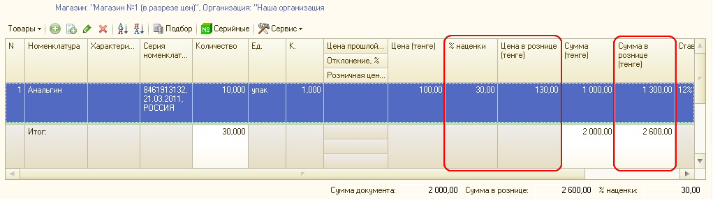 Конфигурация «Аптека для Казахстана» позволяет вести учет остатков лекарственных средств в разрезе розничных цен. Ряд аптек использует среднюю розничную цену при продаже медикаментов, в то же время, другие аптеки фиксируют индивидуальные розничные цены для каждого поступления и хранят остатки в разрезе полученных розничных цен. В этом случае не требуется вводить дополнительный документ для установки цен, все данные вносятся в документе «Поступление товаров».
