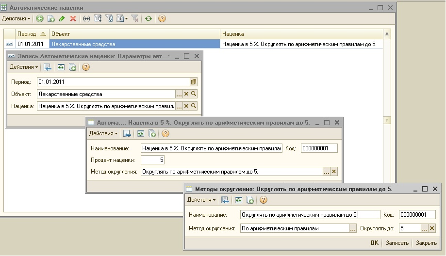 В конфигурации предусмотрена возможность хранения параметров автоматических наценок, таких, как процент наценки и метод округления, которые используются для автоматического расчета розничной цены.