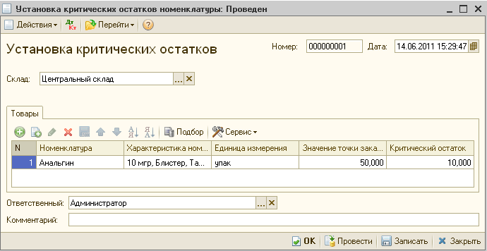 В документе указывается место хранения, для которого устанавливаются границы критических остатков лекарственных средств. В табличной части перечисляются лекарственные средства, указывается критический остаток - минимальное количество номенклатуры на складе, значение точки заказа.