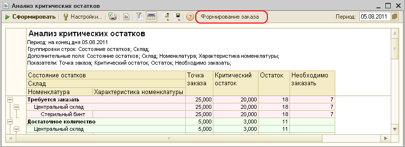 Из отчета «Анализ критических остатков» может быть запущен механизм формирования документов «Заказ поставщику». Для этого на форме отчета предусмотрена кнопка «Формирование заказа».