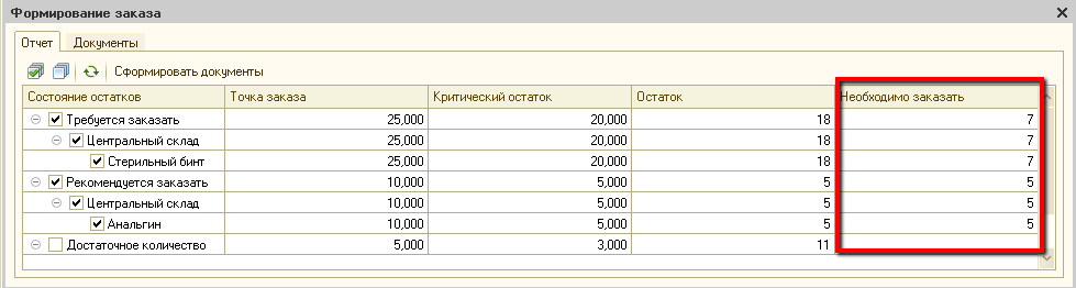 Пользователю необходимо отметить те позиции, которые он хочет заказать. Количество номенклатуры указывается в колонке «Необходимо заказать».
