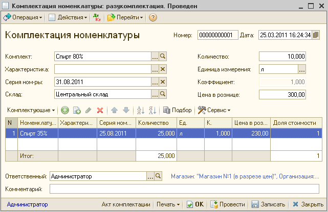 Документ имеет реквизит «Операция», который определяет производимое действие: комплектацию или разукомплектацию лекарственного средства.