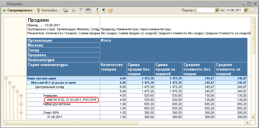 В отчет выводится информация о количестве проданных товаров со скидкой, без скидки, средней стоимости проданных товаров и т.д. В отчете есть возможность вывода серий номенклатуры.