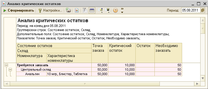 Данный механизм представляет собой форму, в которой отображается дерево значений, содержащее результат отчета «Анализ критических остатков».