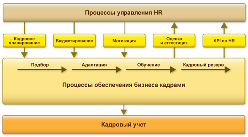 В конфигурации реализованы все основные направления автоматизации управления персоналом крупного предприятия: подбор, адаптация, мотивация, обучение, оценка, управление талантами, кадровый резерв, управление расходами на персонал, проведение аттестаций, поддержка грейдов, управление социальными льготами, анкетирование. Большинство механизмов снабжены рабочими местами – специальными формами, объединяющими необходимый функционал для выполнения отдельных бизнес-процессов. С учетом особенностей системы управления персоналом в крупных компаниях реализована поддержка процессов "заявка – согласование – утверждение".